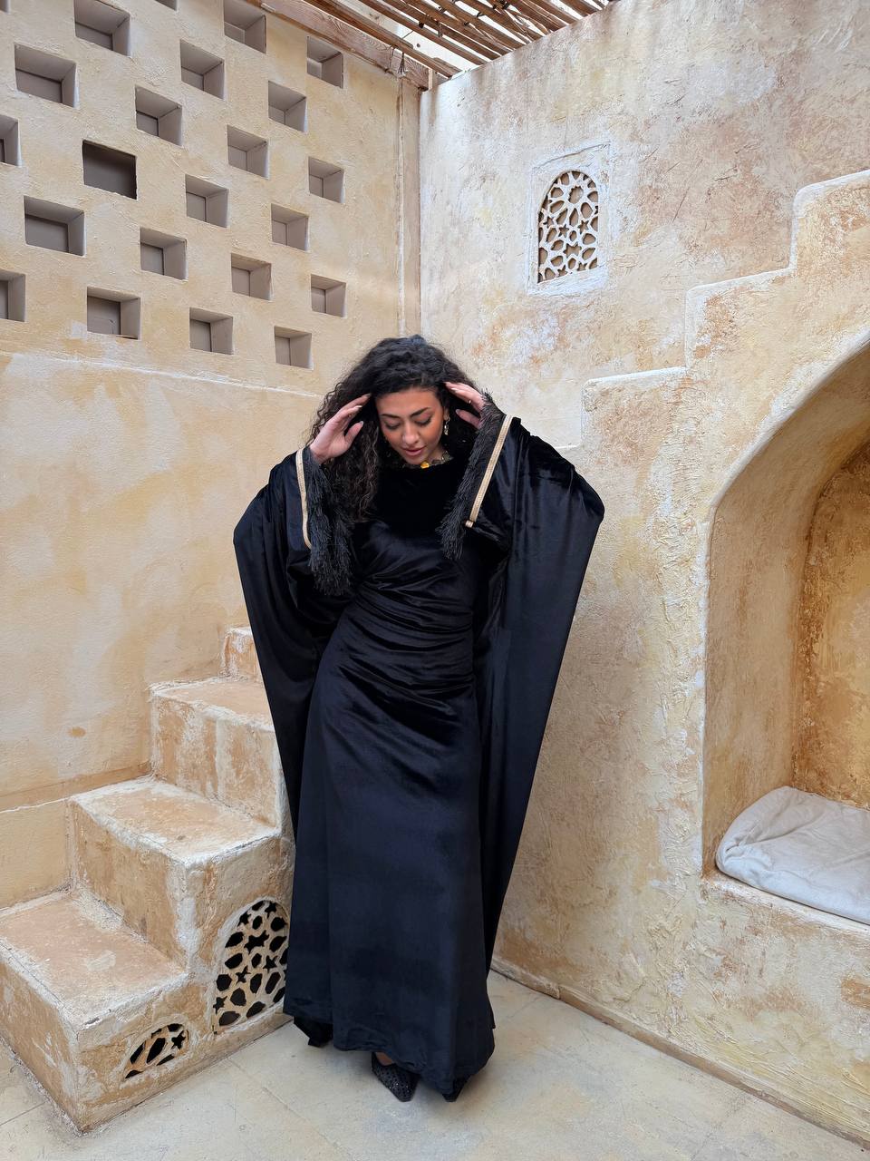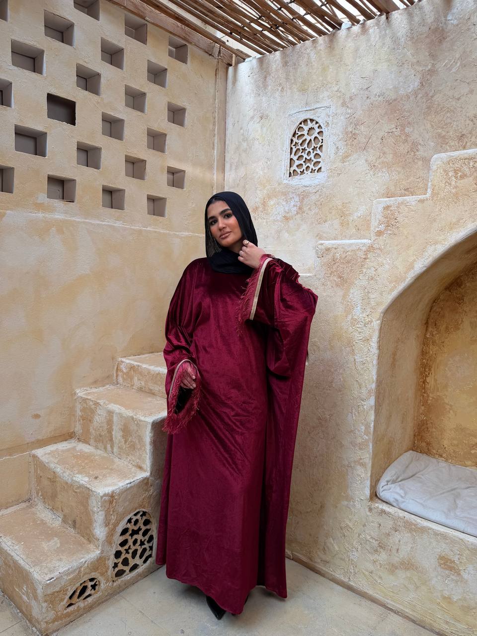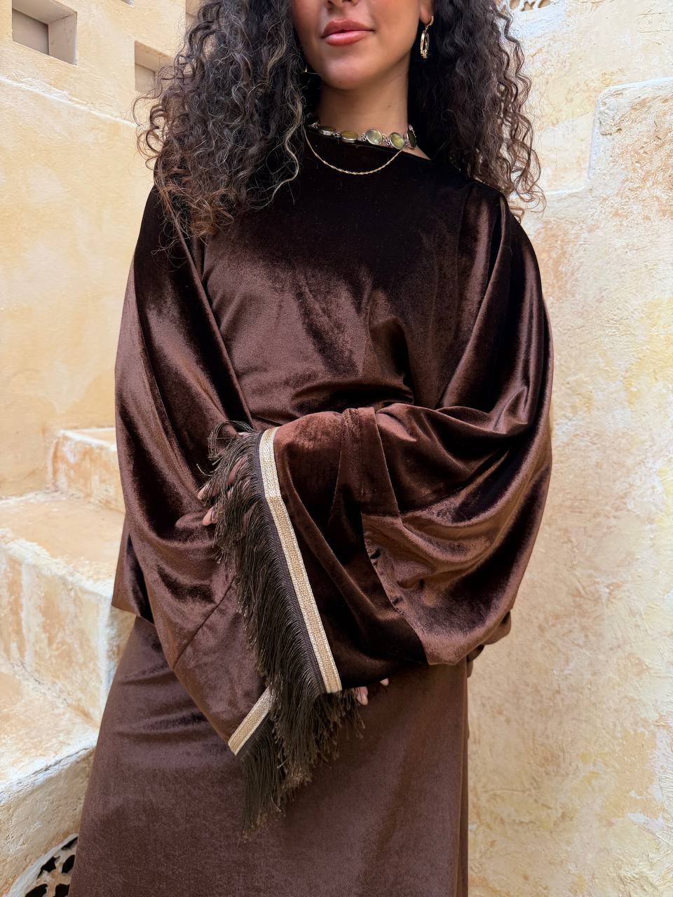 فستان من خامة قطيفة ناعمة وفخمة، بتصميم أنيق مع شراشيب على الأكمام تضيف حركة ولمسة مميزة تخطف العين 😍. تلبيس شيك ومثالي للمناسبات والسهرات.