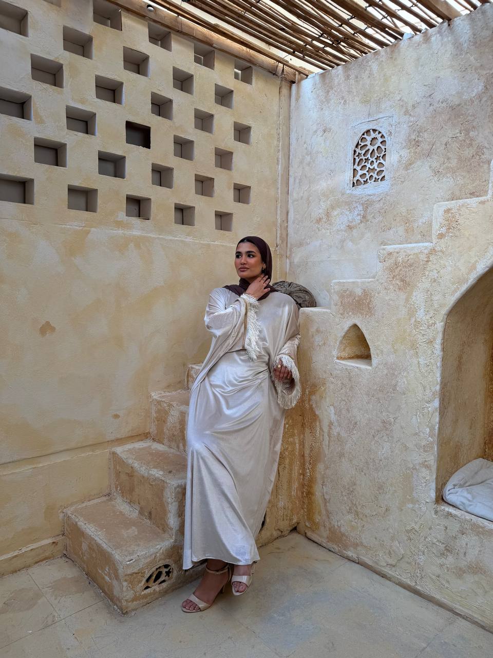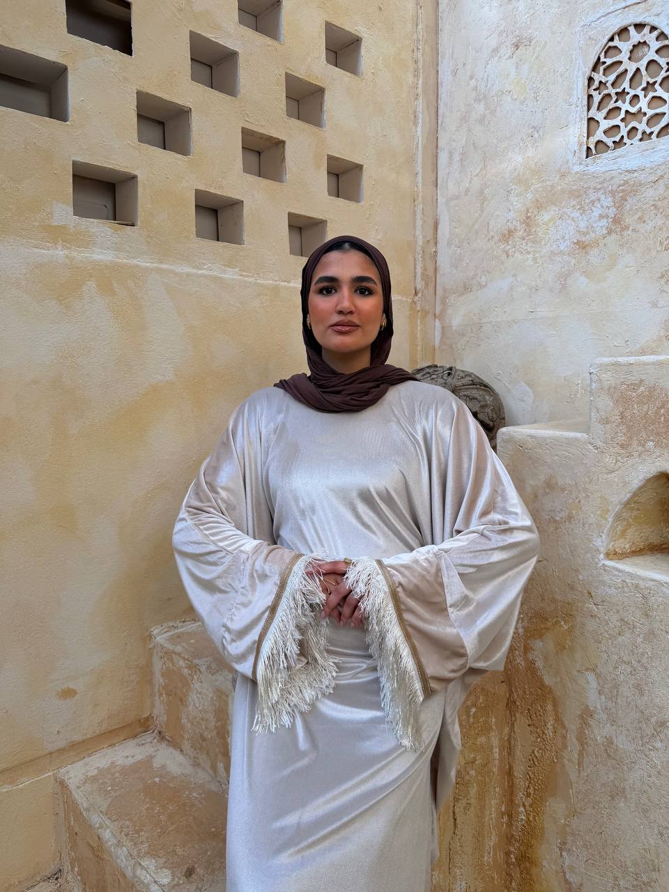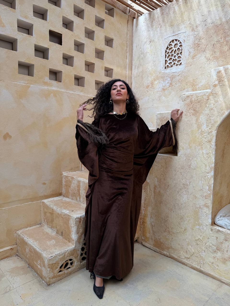 فستان من خامة قطيفة ناعمة وفخمة، بتصميم أنيق مع شراشيب على الأكمام تضيف حركة ولمسة مميزة تخطف العين 😍. تلبيس شيك ومثالي للمناسبات والسهرات.